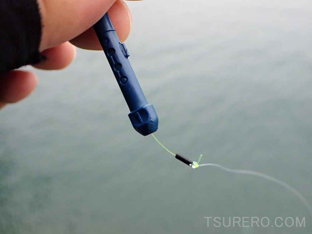 今回はゼロピットカン付きホルダーのテストと一緒に、カラマン棒やナビを使用せず、ラインストッパーのゴムをサルカンの上に取り付けただけのシンプル仕掛けも試してみました。