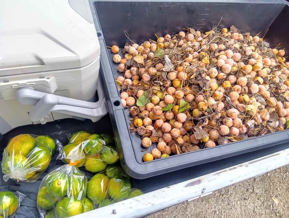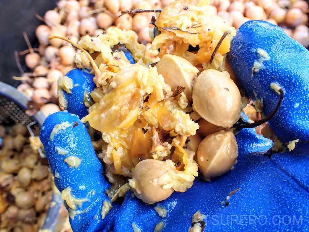 そして、この果肉がまだ若ければ、硬くて剥くのが難しいので、何日かごみ袋に入れておいたり、水に浸けておいて腐らせて剥きやすくしてから処理します。