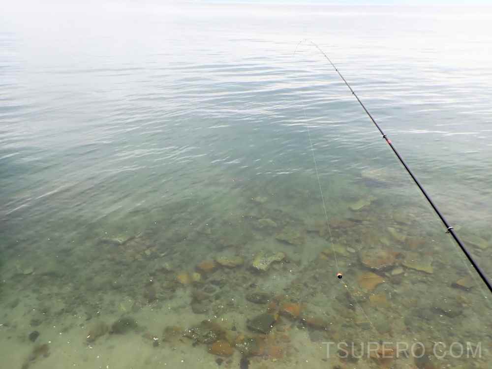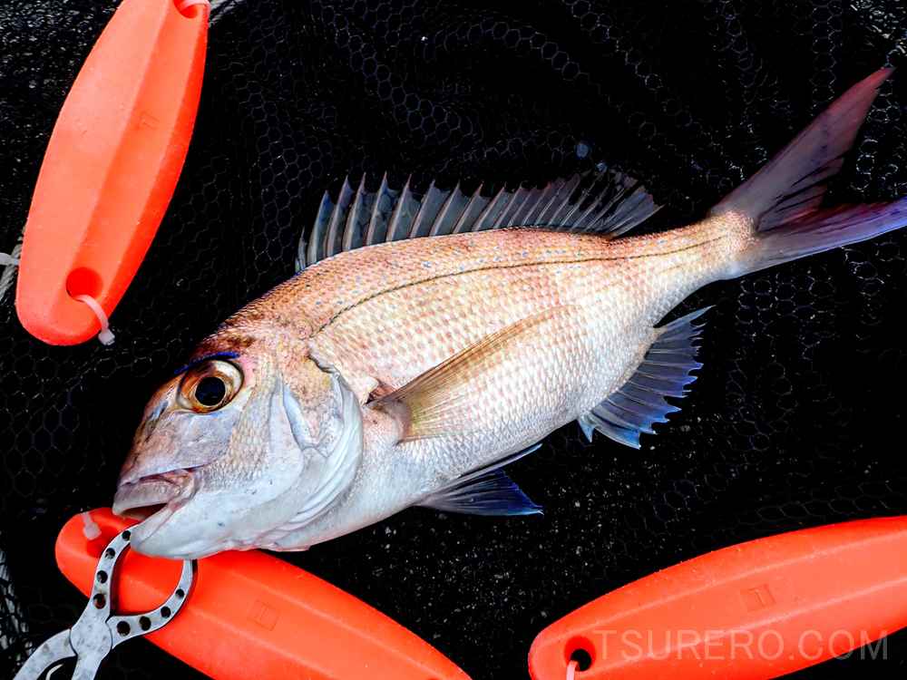 とりあえず足元のフグは活性があるんですが、なぜか沖には出ていきません。そして少し沖では刺し餌が延々と取られずに戻ってくるので、「これはヤバいやつだわ・・・」と思っていたら、運よく通りすがりのマダイがヒットしてくれました!助かったぜ!