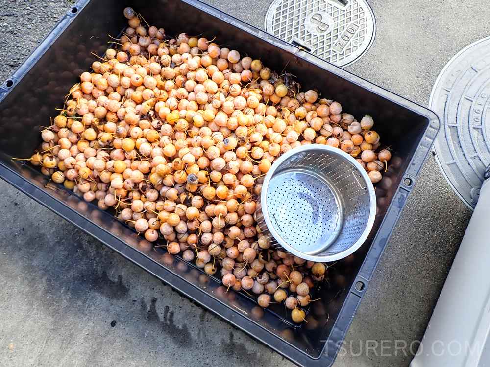 銀杏を剥く方法は色々あって、高圧洗浄機を使ったり、川でザルに入れて潰しながら揉み洗いのようにして剥いたりと色々です。