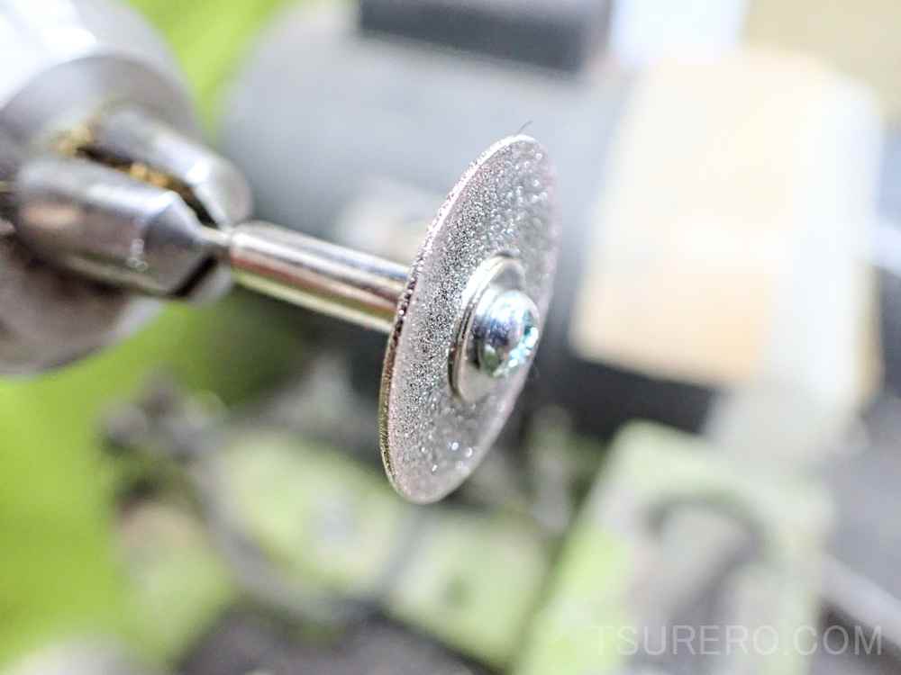 ノコギリで切れ目を入れてもいいんですが、今回はルーター用の切断砥石を木工旋盤に取り付けて加工しました。