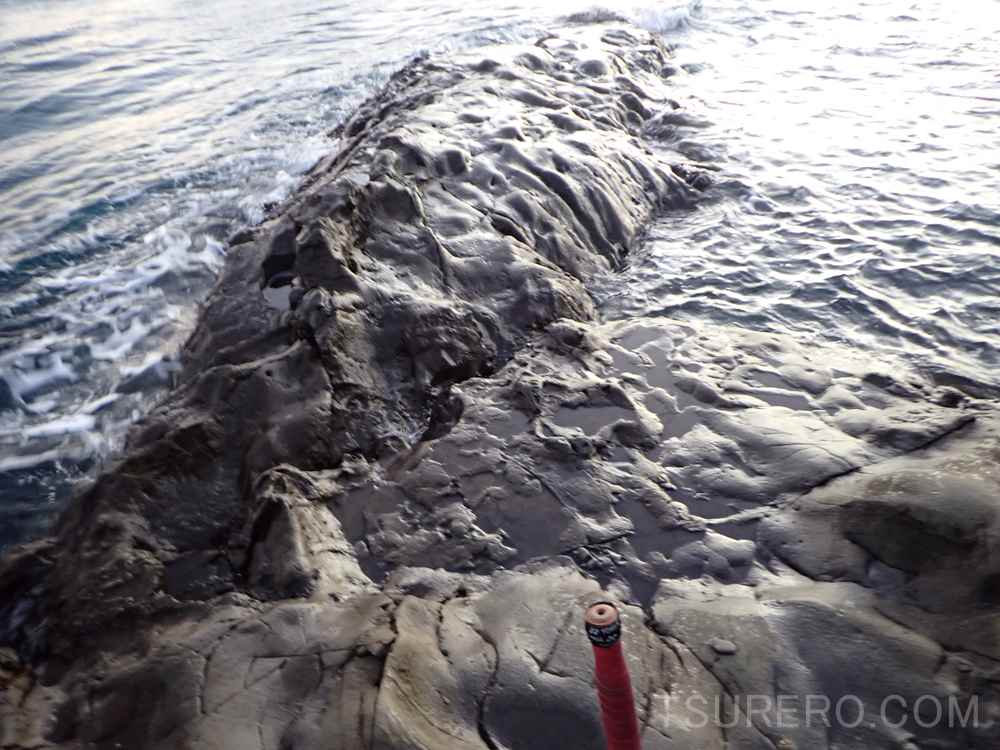 最後の方でこちらに釣り座を変わってもらったんですが、写真真中下に見える磯の下がエグレていて、スズメやハギ達の餌取りに混じって良型のグレが見えました。