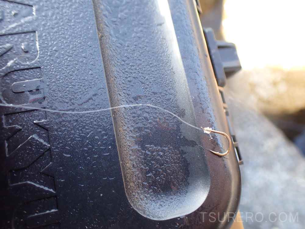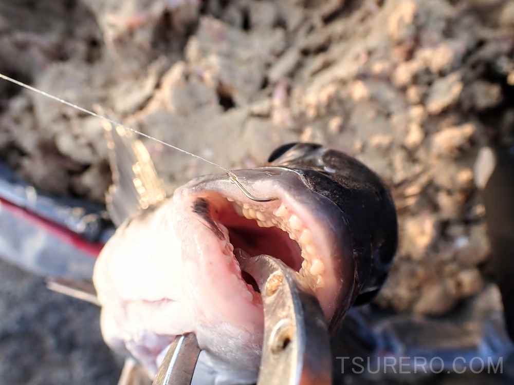 結局、フロロカーボンのロングハリスだと潮に取られすぎてしまって難しかったので、ナイロンに1.2号ハリスを2ヒロ直結して、メンディングで剥がしやすいラインセッティングに変更。