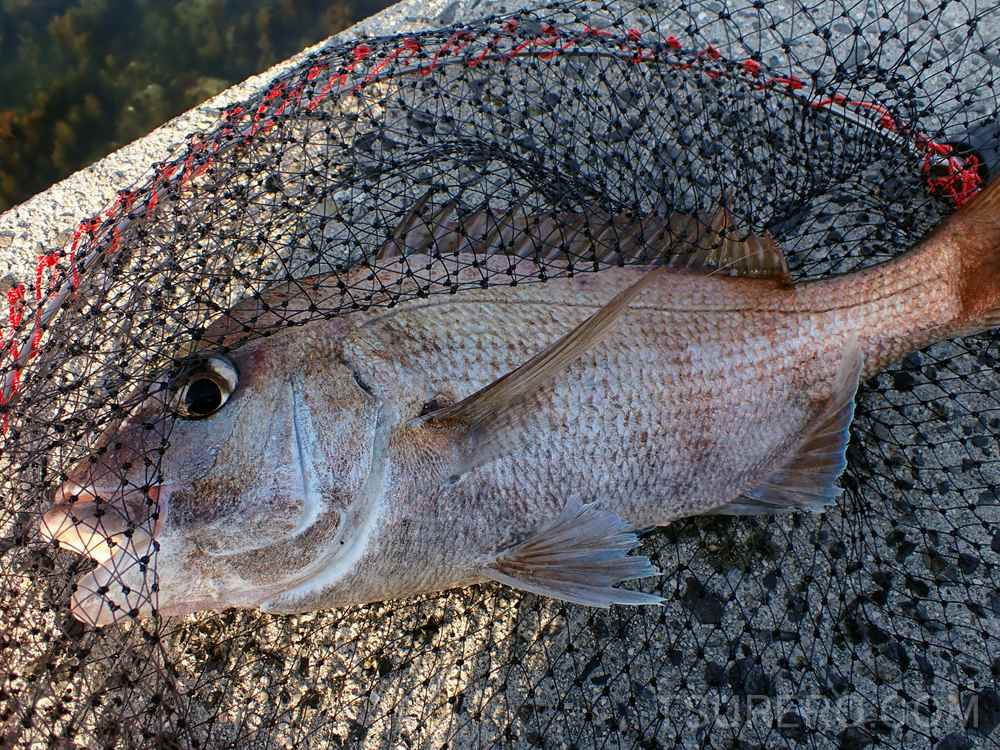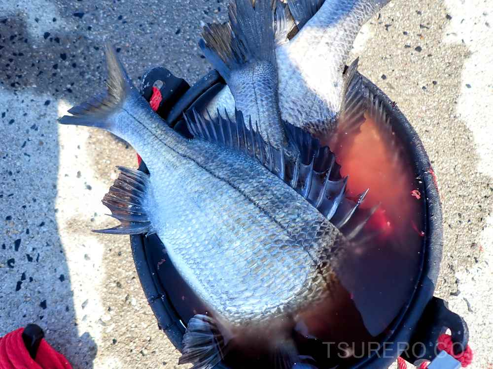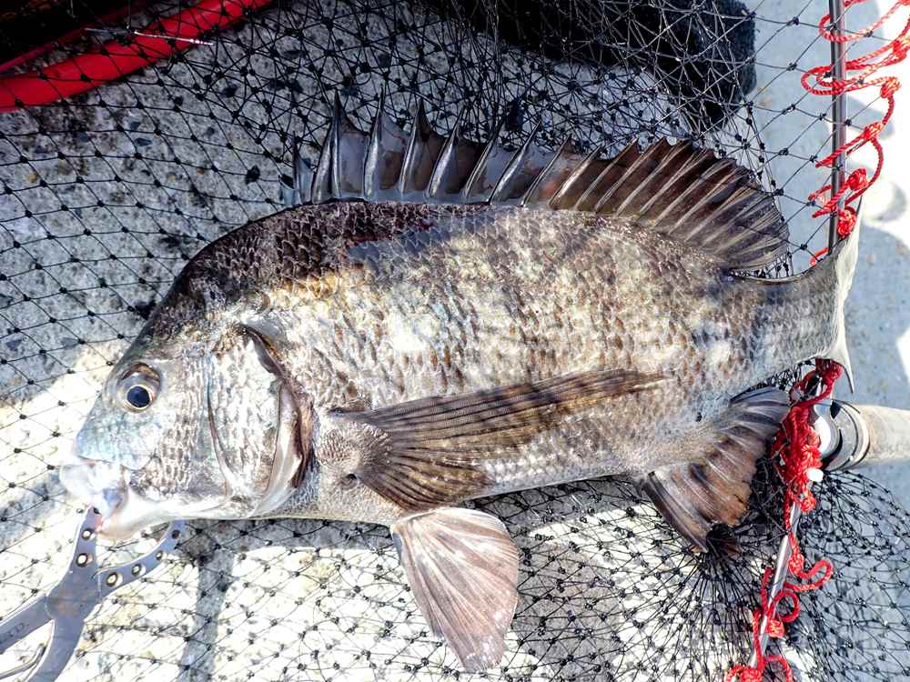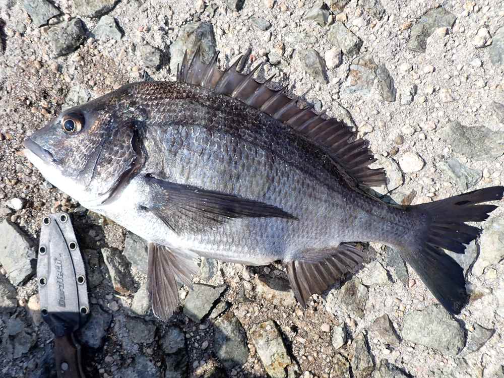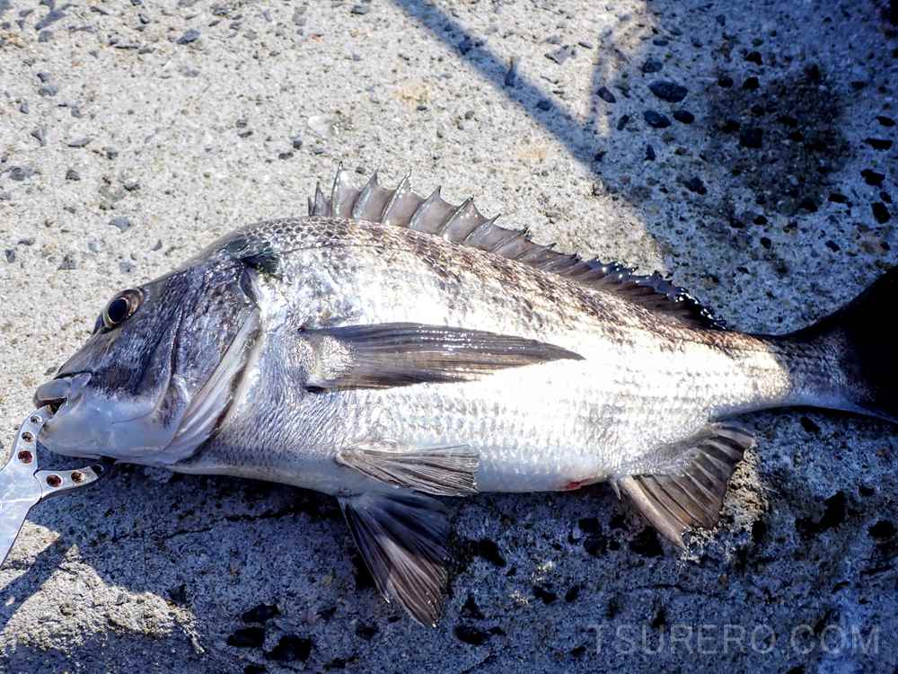 8時くらいから釣りを開始して、朝一番に足元の掛け下がりの一番下の際で45cm前後のマダイがヒット。