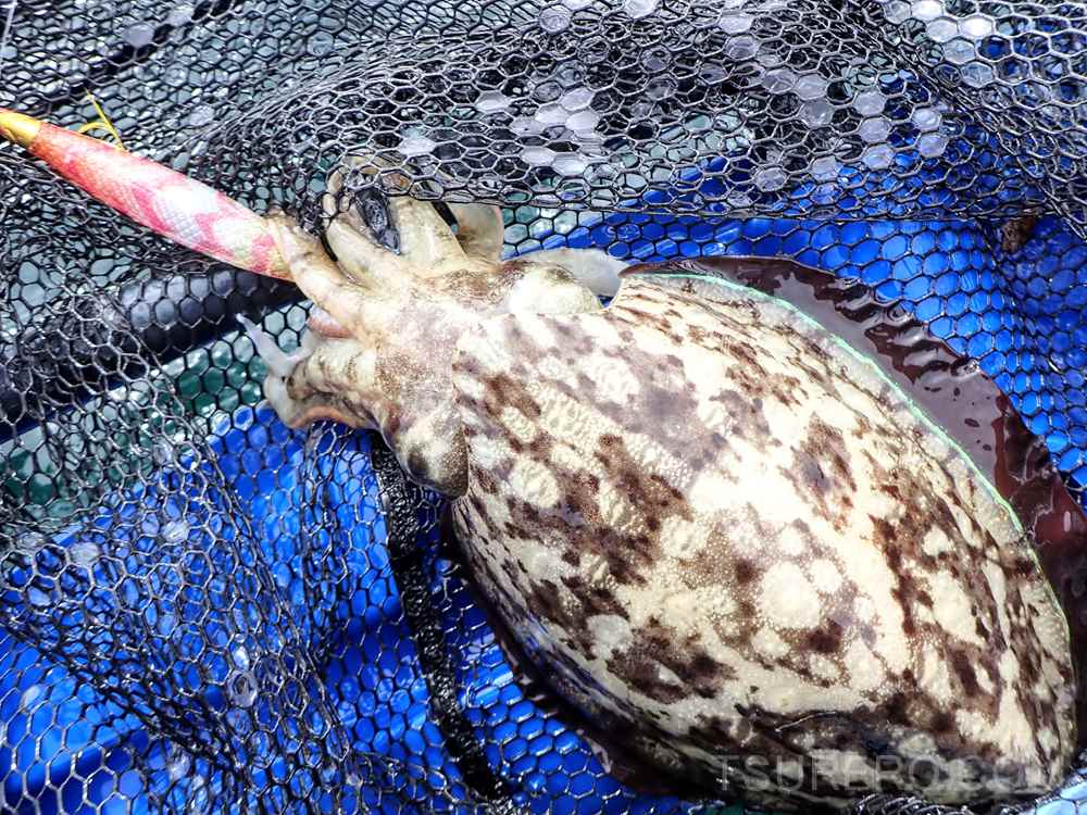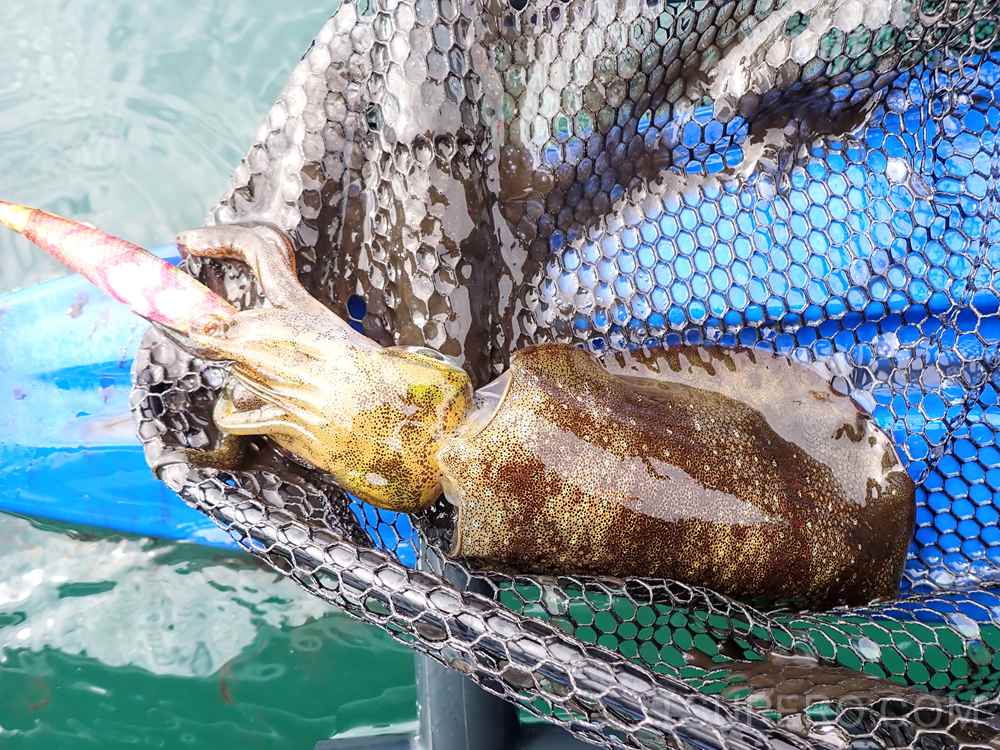 慣れてくると、イカが浮き上がってくるときにエギの方向を見ておいて、ロッド操作でボートに対して横を向けて海面に出してからネットインできるようになります。